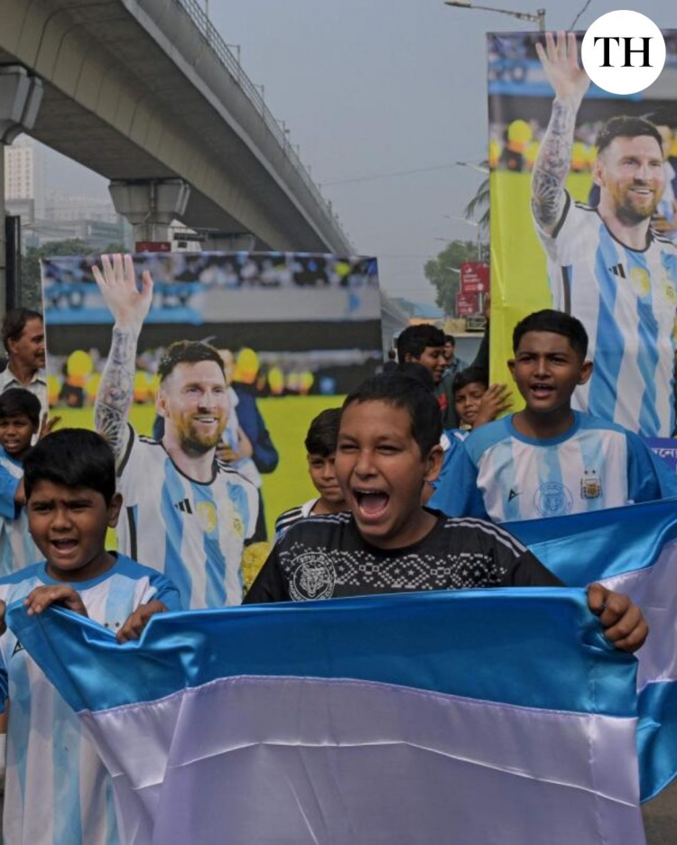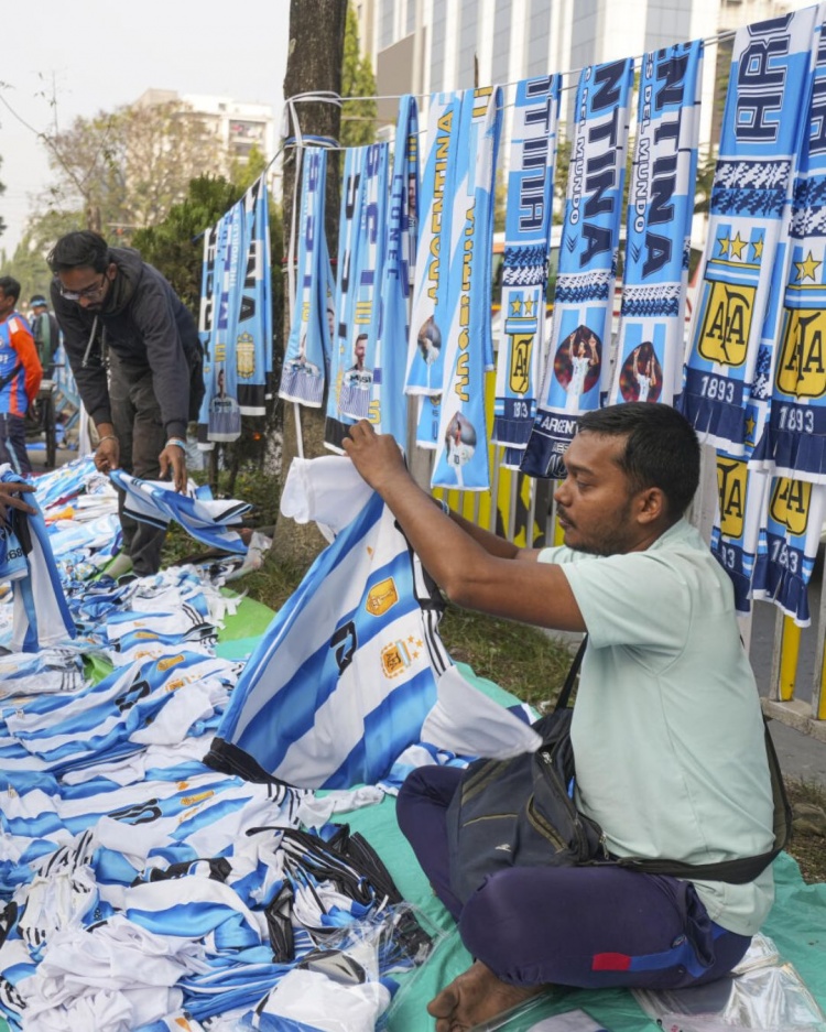 印度球迷在地上画画欢迎梅西,商贩现场售卖梅