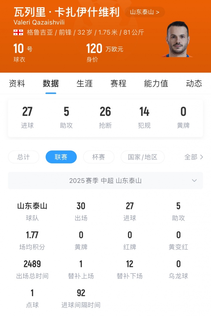 27球5助!官方:泰山前锋卡扎伊什维利荣膺2025赛