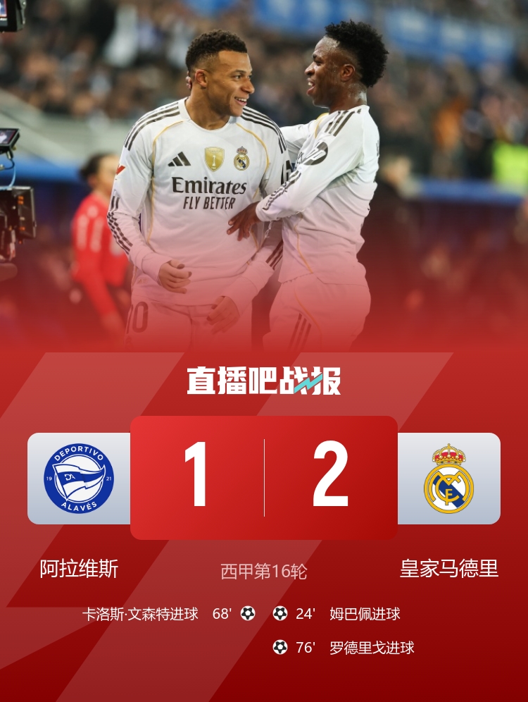 西甲联赛第16轮,皇马客场2-1战胜阿拉维斯,姆巴佩、罗德里戈进球。 距榜首2分!曼城3-0水晶宫各项赛事五连胜 哈兰德双响福登建功