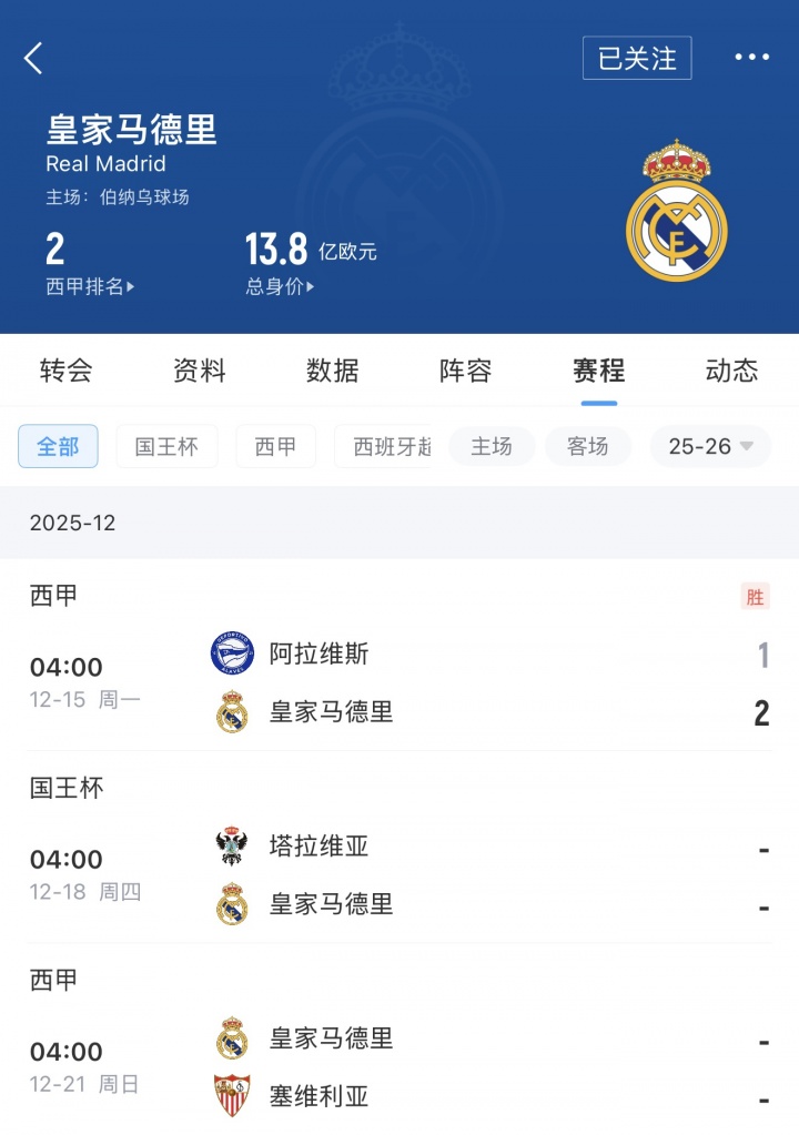 足球比分网12月15日讯 皇马2-1阿拉维斯,姆巴佩打入一球,2025年度的俱乐部进球数来到56球。 在皇马历史自然年进球榜上,姆巴佩追平了2014年的C罗,并列第三位。前两位分别是2012年的C罗(58球)和2013年的C罗(59球)。 皇马历史自然年进球榜 1、C罗 59球 2013年 2、C罗 58球 2012年 3、C罗 56球 2014年 3、姆巴佩 56球 2025年 5、C罗 54球 2015年 6、C罗 53球 2011年 皇马2025年剩余赛程