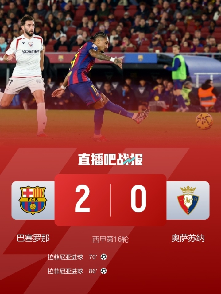 拉菲尼亚双响,巴萨2-0奥萨苏纳,各赛事五连胜先赛7分领跑。 止3轮不胜!切尔西2-0埃弗顿暂升第4 古斯托传射帕尔默复出首球