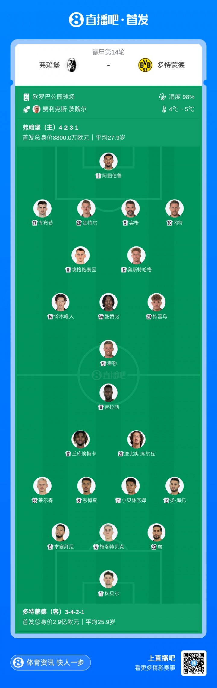 多特vs弗赖堡首发:小贝林、吉拉西先发,恩梅查