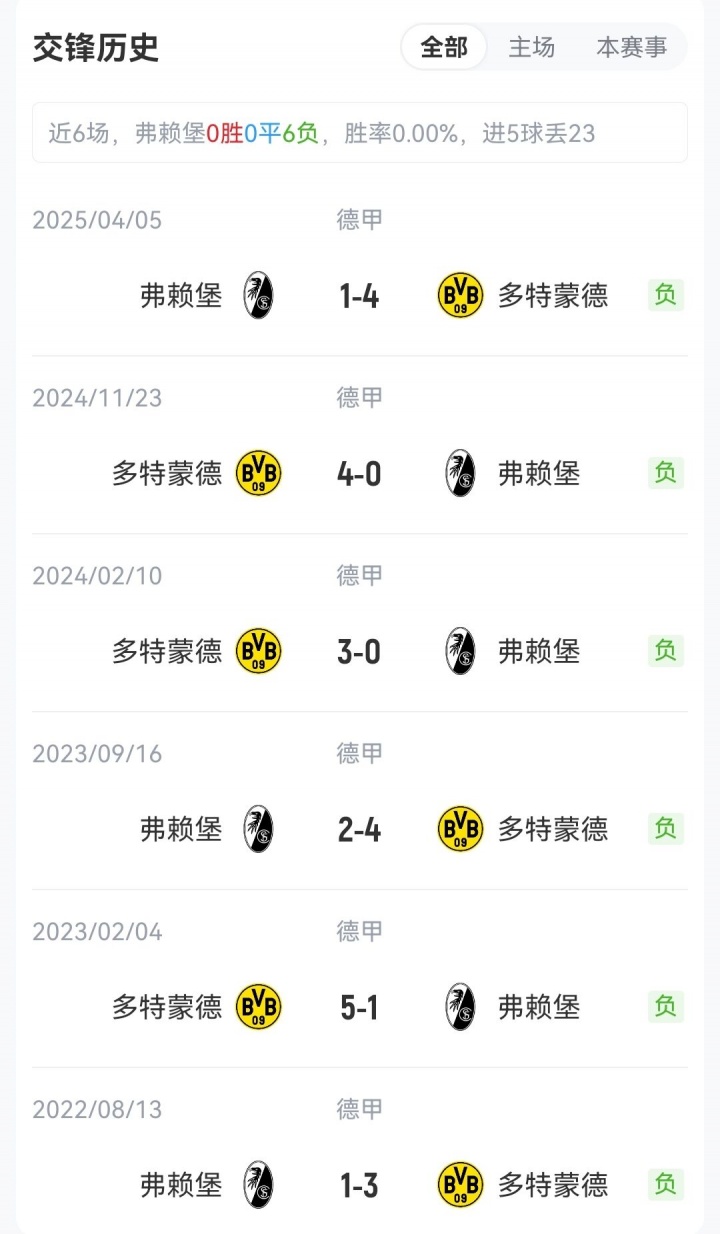 在目前的德甲积分榜上,多特蒙德8胜4平1负积28分,位列第3,;弗赖堡则是4胜4平5负积16分,位列第10。 【双方交手历史】