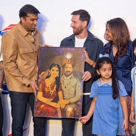 足球比分网12月14日讯 梅西今日抵达孟买,开启印度行第三站。 梅西、德保罗和苏亚雷斯参加活动,Sangita Jindal晒出照片,梅西获赠自己和安东内拉身着印度传统服饰的画像。