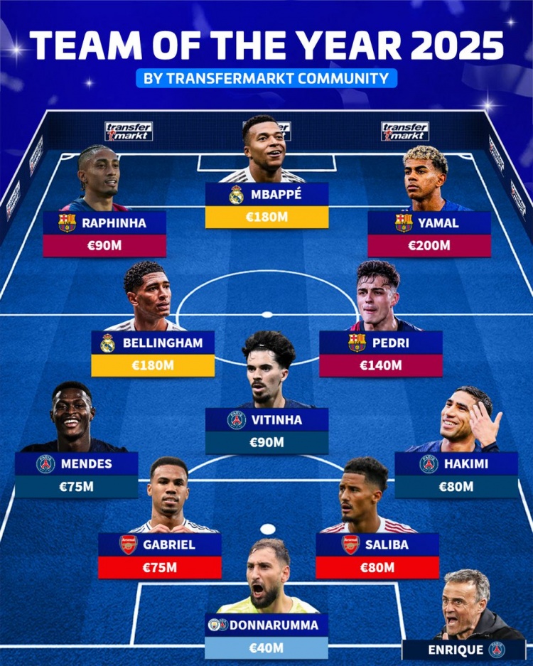 足球比分网12月8日讯 德转列出经投票选出的2025年度最佳阵,姆巴佩、亚马尔、贝林厄姆、佩德里在列。 德转票选2025年度最佳阵: 门将:多纳鲁马(巴黎/曼城,4000万欧) 后卫:阿什...