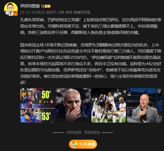 足球比分网12月10日讯 本轮欧冠多场比赛战罢,国米0-1利物浦,巴塞罗那2-1法兰克福,亚特兰大2-1切尔西,热刺3-0布拉格斯拉维亚。赛后,评述员詹俊先生在社媒做出点评。 詹俊:孔德...