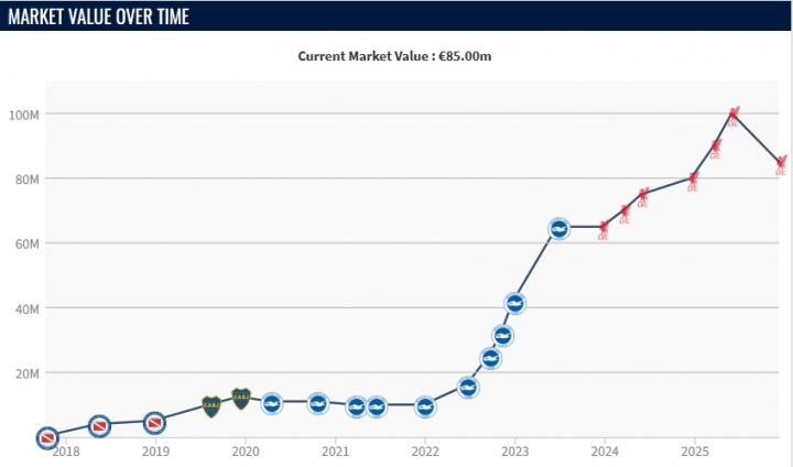 麦卡身价变化曲线图 足球比分网12月10日讯 德转昨日更新英超球员身价,利物浦中场麦卡利斯特身价半年间从1亿欧跌至8500万。 今日欧冠联赛第6轮,利物浦主场1-0击败国米,麦卡利斯特...