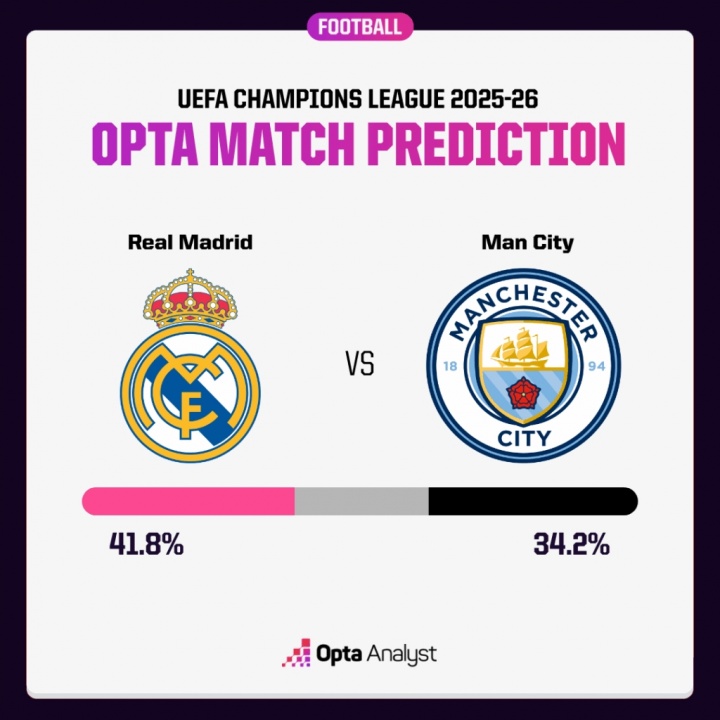 足球比分网12月10日讯 北京时间12月11日凌晨4点,欧冠联赛阶段第6轮皇马将在主场大战曼城,赛前数据机构Opta略微看好皇马取胜。 数据预测显示,皇马本场比赛的胜率为41.8%,曼城客场...