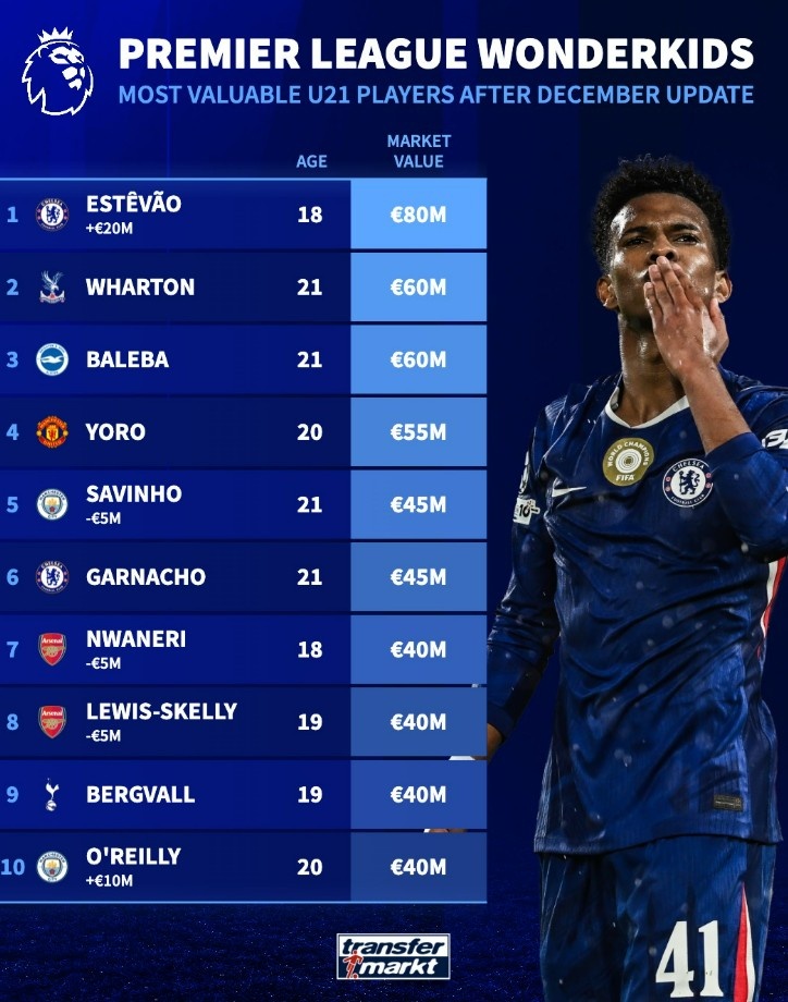 足球比分网12月9日讯 德转更新了英超球员身价,并盘点了目前U21球员身价榜,具体如下: 1、埃斯特旺(切尔西),18岁,8000万欧 2、沃顿(水晶宫)21岁,6000万欧 3、巴莱巴(布莱顿)...