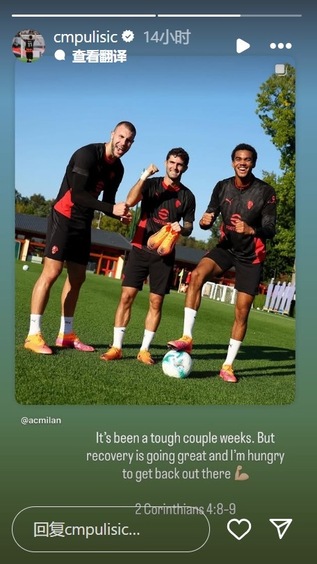足球比分网10月24日讯 普利西奇在个人社媒分享训练照,他表示自己渴望回到赛场。 在本月的国际比赛日,米兰球员普利西奇在为美国队出战时受伤。昨天,米兰晒出普利西奇与帕夫洛...