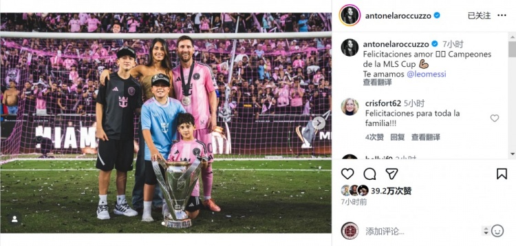 足球比分网12月7日讯 美职联总决赛,梅西送出2记助攻,帮助迈阿密国际3-1击败温哥华白浪,捧起冠军奖杯。 梅西妻子安东内拉社媒晒出全家与奖杯的合照,配文:“祝贺你,亲爱的,...