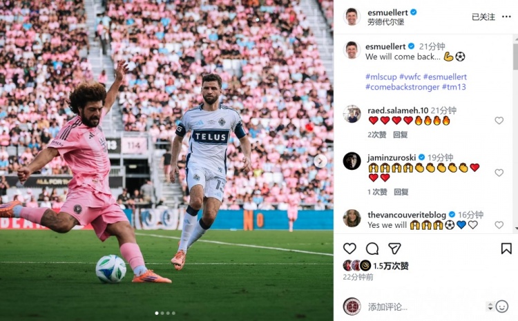 足球比分网12月8日讯 美职联总决赛,穆勒踢满全场,温哥华白浪1-3不敌迈阿密国际,无缘冠军。 穆勒赛后更新社媒动态,他晒出总决赛的比赛照片,并配文:“我们会回来的!”...
