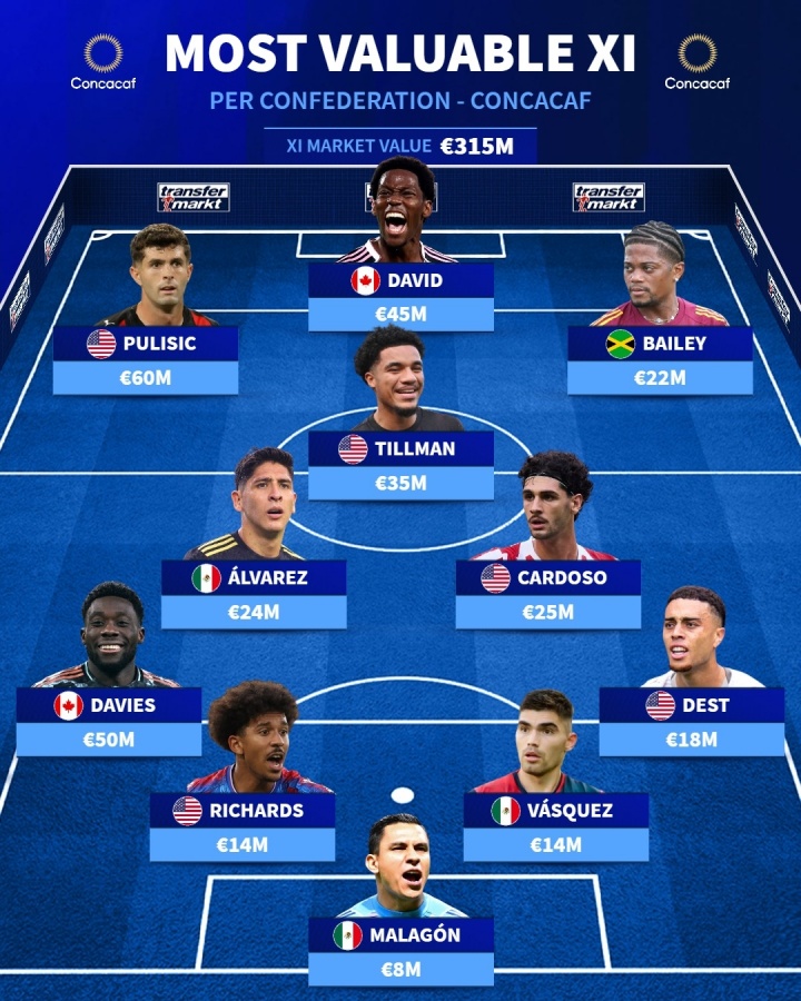 足球比分网10月16日讯 德转盘点了中北美及加勒比海足联球员的最高身价阵容,整套阵容总价值高达3.15亿欧元。其中美国边锋普利西奇以6000万欧元成为身价最高的球员,加拿大后卫阿方...