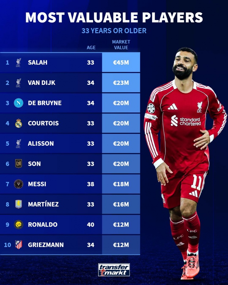 足球比分网12月7日讯 德国转会市场统计了年龄33+球员的身价,并列出榜单,萨拉赫4500万欧居首,梅西1800万欧第七。 年龄33+球员德转身价排名: 萨拉赫(33岁)——4500万欧 范戴克(...