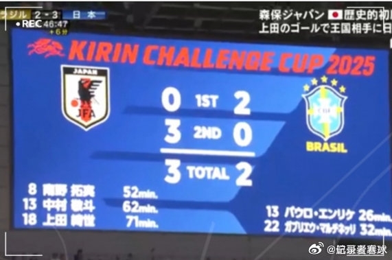 足球比分网10月14日讯 日本队(FIFA排名第19位)在刚刚结束的热身赛中,以3-2逆转战胜了巴西队(FIFA排名第6位)。 上半场结束时,日本队以0-2落后。然而,下半场开始后仅7分钟,中场...