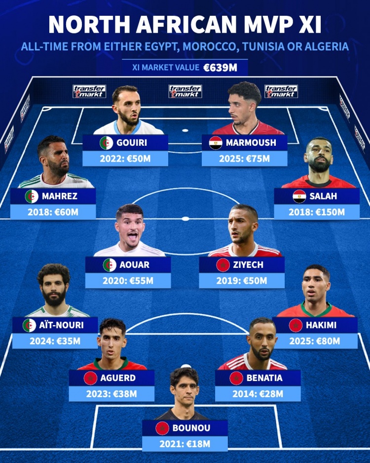 足球比分网10月15日讯 德国转会市场列出了北非国家(埃及、摩洛哥、突尼斯、阿尔及利亚)球员历史身价最高阵容,萨拉赫、马赫雷斯、马尔穆什在列。 北非历史身价最高阵容(取球...