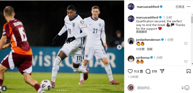 足球比分网10月15日讯 世预赛欧洲区比赛,英格兰客场5-0击败拉脱维亚,提前锁定世界杯参赛资格。 拉什福德此役为英格兰替补出场,赛后他在社交媒体上晒出比赛照片,配文:“获得...