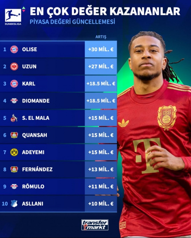 足球比分网10月15日讯 德国转会市场公布了新一期的德甲球员身价情况,在涨幅榜上,奥利塞身价上涨3000万欧元最多,法兰克福小将乌尊上涨2700万欧元位居次席。 以下为德甲球员身价...