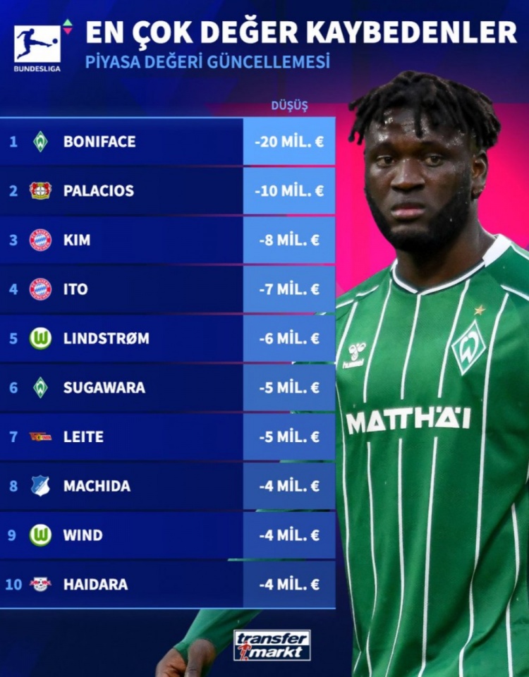 足球比分网10月15日讯 德国转会市场公布了新一期的德甲球员身价情况,在跌幅榜上,博尼法斯跌2000万欧最多,帕拉西奥斯跌1000万欧位居次席。 以下为德甲球员身价跌幅榜top10: 1、博...