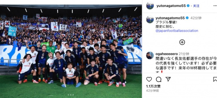 足球比分网10月14日讯 国际友谊赛,日本队主场3-2逆转击败巴西队,队史首次击败对手。 赛后38岁日本队老将长友佑都更新社媒,晒出了赛后全队合照,并配文庆祝胜利:“击败巴西队...