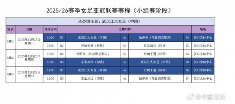 足球比分网10月9日讯 根据中国足协官方消息,女足亚冠卫冕冠军武汉女足新赛季亚冠小组赛赛程确定,比赛11月17日-23日在汉口文体中心进行。 小组赛结束后,共有8支球队(每组前两名...