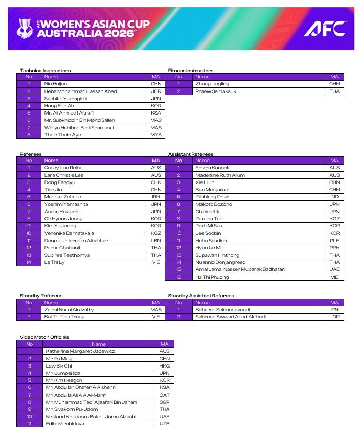 足球比分网10月10日讯 中国足协官方发布消息,亚足联公布2026年女子亚洲杯裁判人员名单,本次裁判名单共有45名裁判员,其中含有11名视频比赛官员、4名预备裁判员。本次比赛中国足...