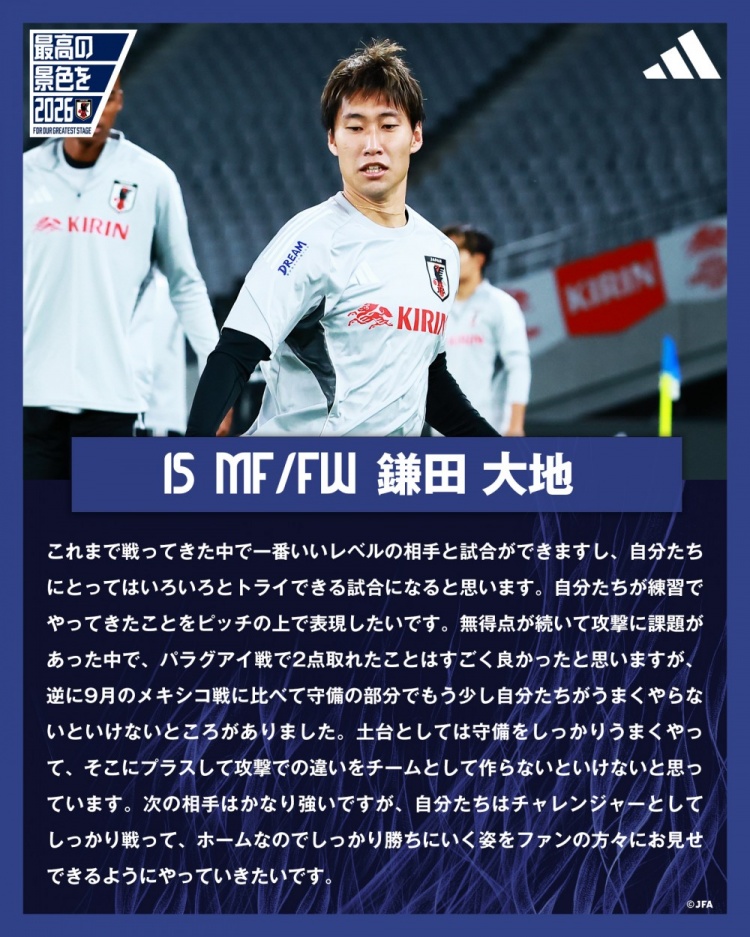 足球比分网10月14日讯 北京时间今晚18:30,国际友谊赛日本队将在主场迎战巴西队。日本国家队官推更新,晒出昨日训练后镰田大地接受采访的内容。 镰田大地表示:“接下来与巴西队...