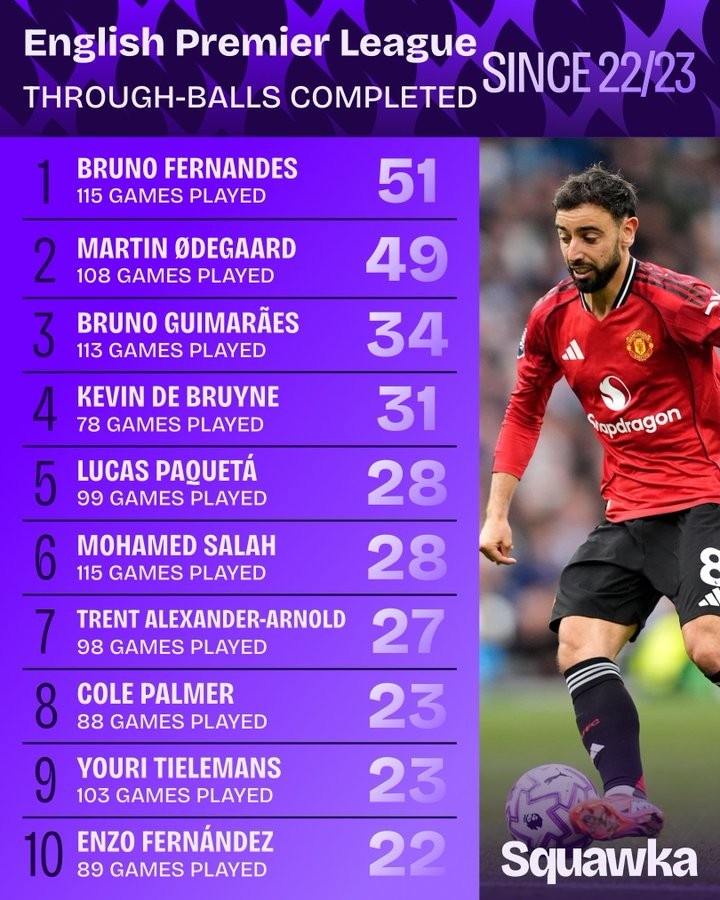 足球比分网10月13日讯 根据数据机构Squawka的统计,自2022/23赛季以来,B费在英超联赛中以115场比赛完成51次成功直塞的数据高居榜首。厄德高以108场比赛送出49次直塞的成绩紧随其后,位...