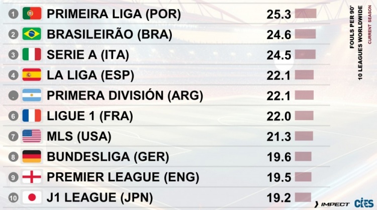 足球比分网10月13日讯 CIES足球天文台统计了全球联赛每90分钟犯规情况,其中葡超以25.3次犯规位居榜首,巴甲则以24.6位居次席。 以下为全球联赛每90分钟犯规次数排行(从多到少):...