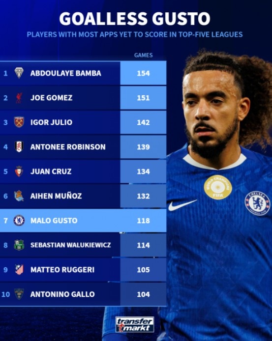 足球比分网10月14日讯 德国转会市场盘点了五大联赛零进球出场比赛最多球员排行,昂热的巴姆巴以154场居首,利物浦的乔-戈麦斯以151场位居次席,而切尔西的古斯托则以118场位居第...