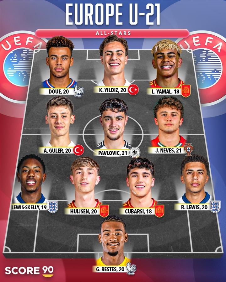 足球比分网10月13日讯 Score 90评选了欧洲U21年龄段的全明星阵容,亚马尔、若昂-内维斯领衔,其中西班牙三人,土耳其、法国、英格兰各两人,葡萄牙、德国各一人。 欧洲U21全明星阵容...