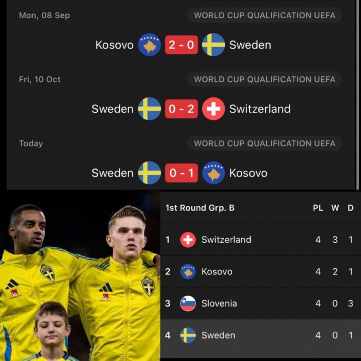 足球比分网10月14日讯 世预赛欧洲区小组赛,瑞典在主场以0-1的比分不敌科索沃。本轮比赛之后,瑞典仅拿1分在小组中积分垫底。 本场比赛,瑞典派出伊萨克和约克雷斯的双前锋组合,...