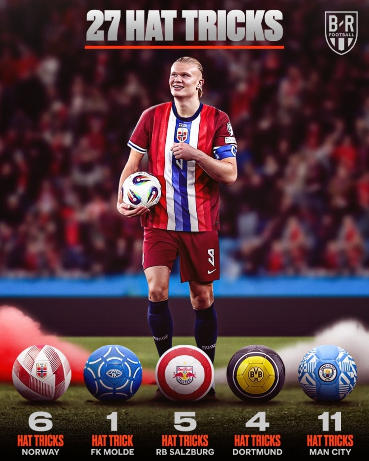 足球比分网10月12日讯 世预赛欧洲区比赛,哈兰德打进3球,帮助挪威主场5-0大胜以色列。据brfootball统计,哈兰德职业生涯至今已经27次戴帽(包括进球超过3粒)。 哈兰德27次戴帽分布:...