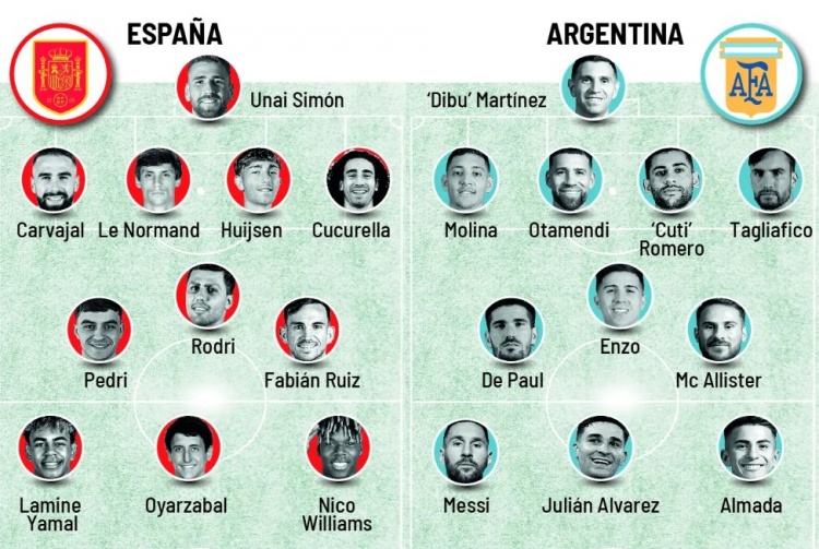 足球比分网10月13日讯 根据《马卡报》报道,西班牙队vs阿根廷队的欧美杯可能明年3月在多哈进行,《马卡报》随后撰文对比了两队首发情况。 附马卡报预测两队首发: 西班牙:乌奈...