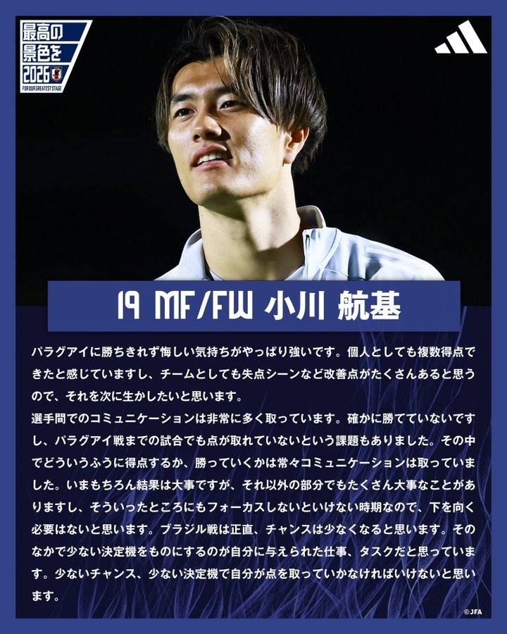 足球比分网10月13日讯 日本国家队官推更新,晒出昨日训练后部分球员接受采访的内容,其中上一场攻破巴拉圭大门的小川航基接受了采访,对与巴西队的比赛进行展望。 小川航基表示...