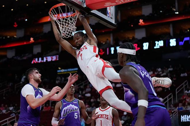 北京时间10月9日,NBA季前赛火箭主场对阵爵士,杜兰特迎来加盟火箭首秀。火箭在开局落后10分情况下,阿门、申京与杜兰特率队强势反扑,尤其是二三两节连续单节轰下40+得分逆袭。...
