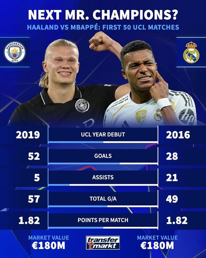 北京时间10月2日,德国转会市场统计了 哈兰德 与姆巴佩前50场欧冠的数据。 哈兰德、姆巴佩前50场欧冠数据对比 欧冠首秀年份 哈兰德:2019年 姆巴佩:2016年 进球数 哈兰德:52球 姆巴...