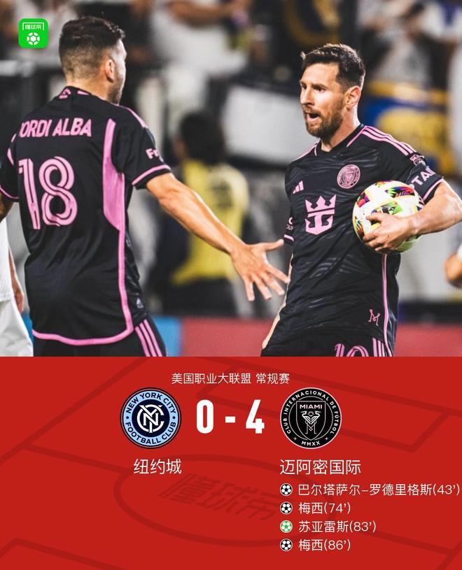 北京时间9月25日美国职业大联盟 常规赛,纽约城主场对阵迈阿密国际。上半场梅西直塞送助攻,巴尔塔萨尔单刀破门。下半场 布斯克茨 直塞,梅西单刀挑射破门,之后 德保罗 造点,...