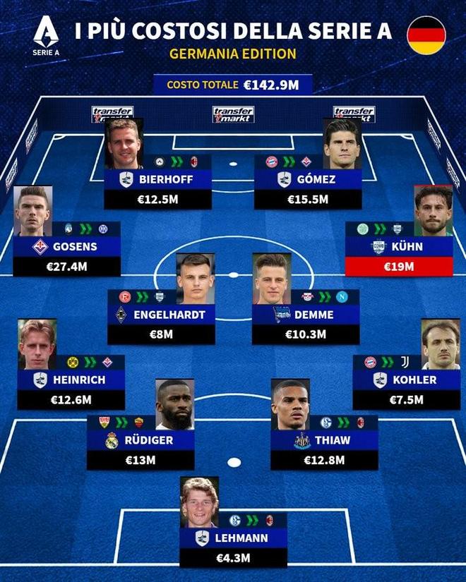 转会市场网统计了德国球员转会至意甲俱乐部身价最高榜单,总身价为1.429亿欧元,其中科莫前锋尼古拉斯-库恩成为第11位上榜球员。 德国球员转会意甲球队价格最高阵容: 门将:莱曼...