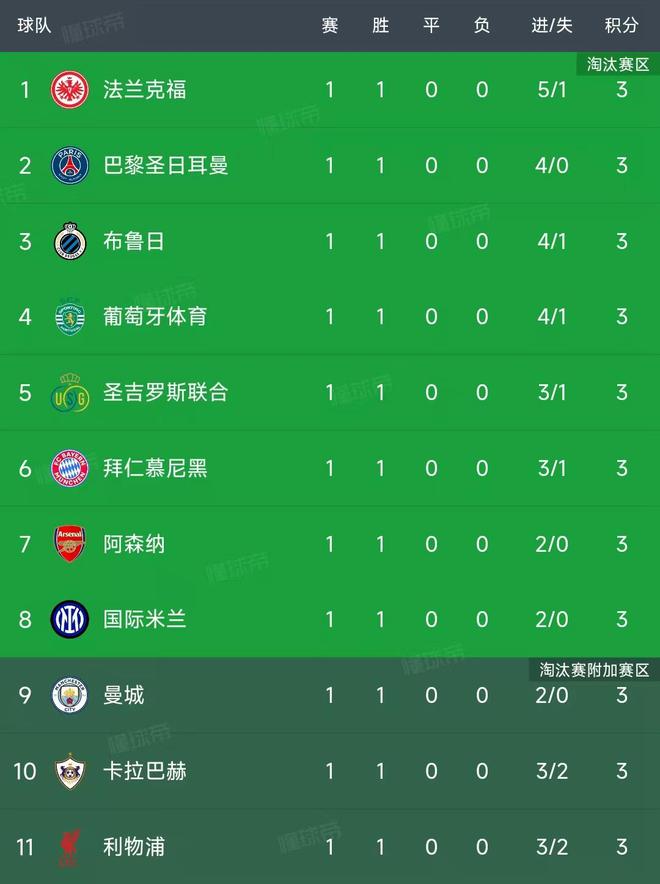 北京时间9月19日,欧冠第一轮最后6场比赛结束,我们一起看看最新积分榜变动,主要的信息如下:曼城2-1 那不勒斯 ,巴萨2-1纽卡斯尔联,布鲁日4-1摩纳哥,勒沃库森2-2哥本哈根、葡萄...