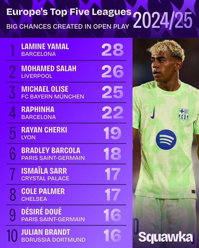 雷速体育9月7日讯 近日,数据公司统计了上赛季五大联赛球员在运动战中创造绝佳机会的次数。亚马尔、萨拉赫、奥利塞位居前三。 24/25赛季运动战创造绝佳机会次数排名 亚马尔(巴塞...