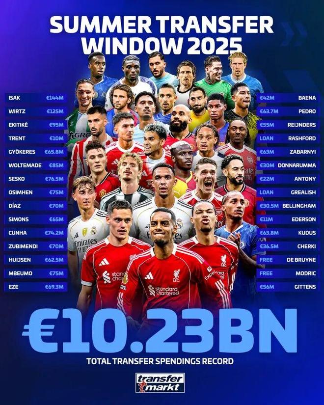 德转发布海报,该机构统计表示,足坛今夏转会窗的总支出达到惊人的102.3亿欧。 这个金额是足坛单个转会窗历史最高,一个世纪级窗口。 夏窗各大联赛投入top10 1:英超 投入35.60亿...