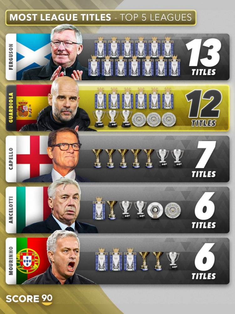 足球比分网12月14日讯 瓜迪奥拉自登陆英超以来,已经带领曼城斩获了6个英超冠军,开创了属于蓝月亮的时代。据score90数据统计,自1990年以来,瓜迪奥拉距离追平弗格森爵士顶级联赛...