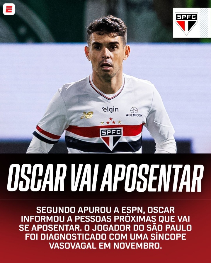 足球比分网12月12日讯 据ESPN巴西版报道,34岁巴西中场奥斯卡已经告诉身边人,自己打算退役。 奥斯卡于上月在常规体检时晕倒,并接受了5天的住院观察。据报道,奥斯卡被诊断为血管...