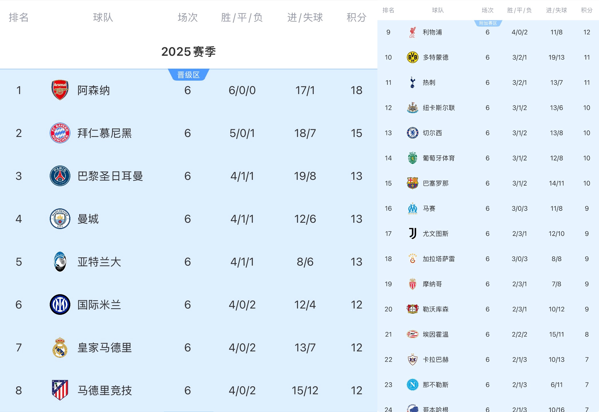 足球比分网12月11日讯 欧冠联赛阶段赛事还剩最后2轮,目前阿森纳、拜仁、巴黎、曼城、亚特兰大5队确定晋级16强或淘汰赛附加赛。 进入淘汰赛阶段后,根据规则,排名前8的球队直通...