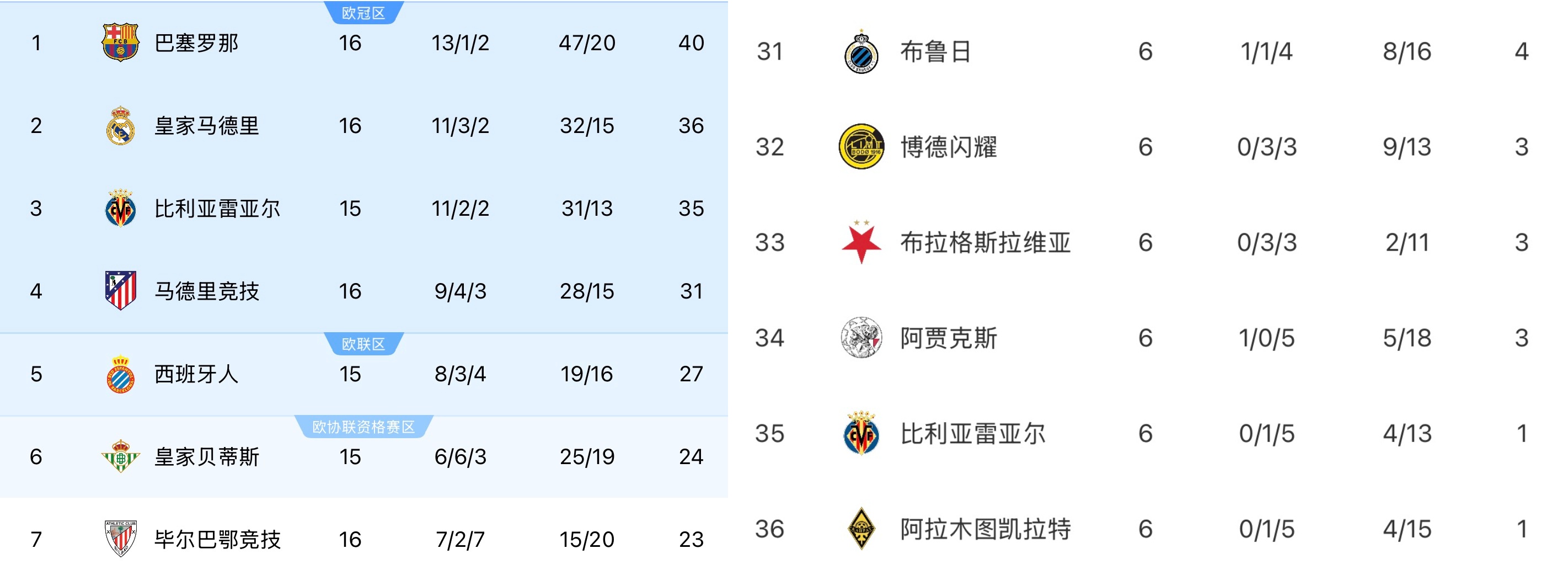 足球比分网12月11日讯 欧冠联赛阶段6轮战罢,最新积分榜如下图所示。欧洲五大联赛参赛球队的场均拿分方面,英超6队参赛场均拿分2.05分最高,西甲5队参赛场均拿分1.33分最低。 其中...