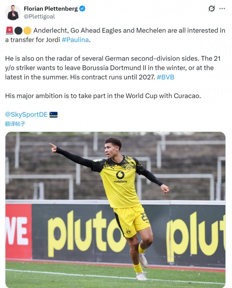 足球比分网12月12日讯 据德国天空体育记者普莱滕伯格报道,多家俱乐部有意多特二队21岁前锋保利纳。 保利纳与多特二队的合同2027年到期,他希望在冬窗转会,最晚在明夏离开,他最...