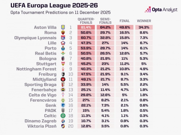 足球比分网12月12日讯 opta在当地时间12月11日对本赛季欧联杯形势进行了新的预测,阿斯顿维拉夺冠概率达到34.3%,罗马8.6%第二。 opta欧联冠军预测: 1、阿斯顿维拉:34.3% 2、罗马:8.6...