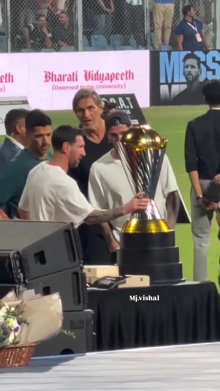 足球比分网12月15日讯 梅西在印度行时观看了活动比赛,并且参与了颁奖。 现场观众拍到梅西看到活动奖杯后掂了掂,随后又用双手举了一下。...