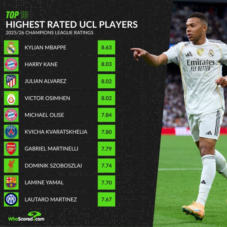 足球比分网12月11日讯 WhoScored统计了本赛季球员在欧冠比赛中的场均评分,并列出评分最高榜单,姆巴佩8.63分居首,凯恩8.03分次席。 本赛季欧冠场均评分榜: 姆巴佩(皇马)——8.6...
